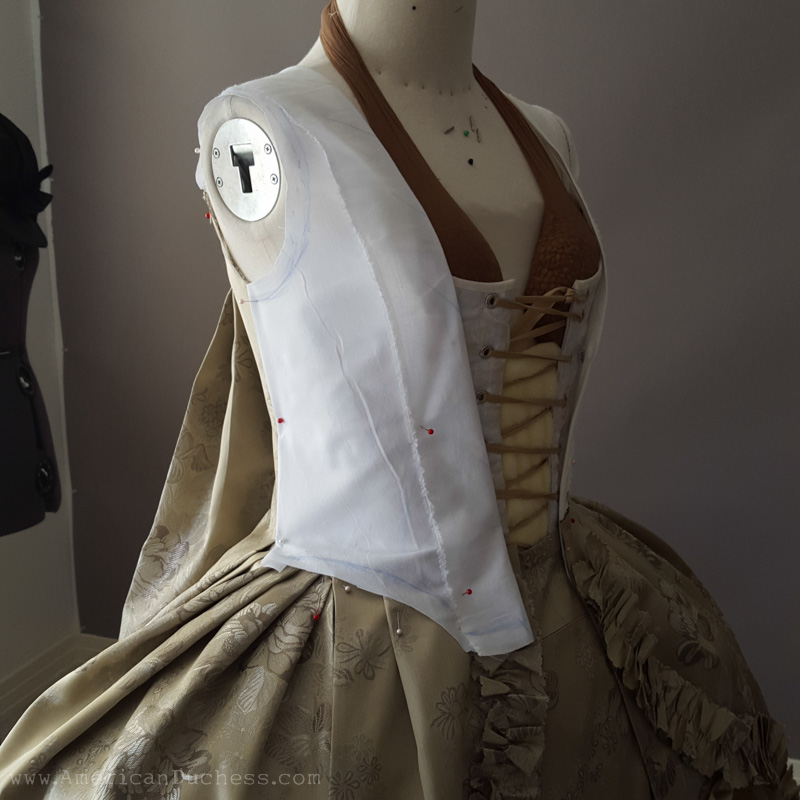 Now I have the bodice, sleeves, and stomacher to do. I draped the bodice piece with the robings extension last night, and will mount the fashion fabric tonight. I've never used the method of robings + pins, but I'm looking forward to the adjustability this offers, both in construction and wearing.