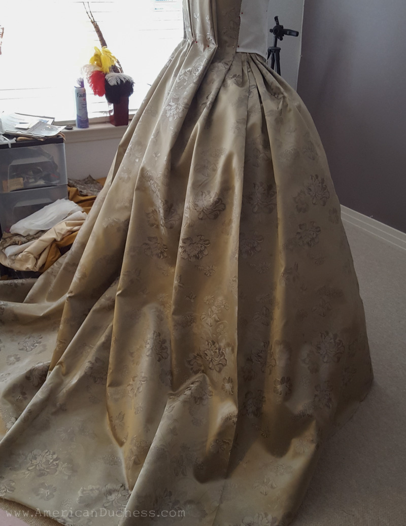 Once the back pleats were stitched to the lining, I cut out the back shape (according to the lining piece), cutting the rest of the skirt out perpendicular at the waist. All that was then pleated up to about the side seam. I did this a couple times to get the voluminous skirt to lay well over the pannier. It's tricky, and effected the train of my gown quite a lot, which indicates to me that I still didn't have enough width in my back pieces for the method/pattern I used to fit over the side of the pannier.