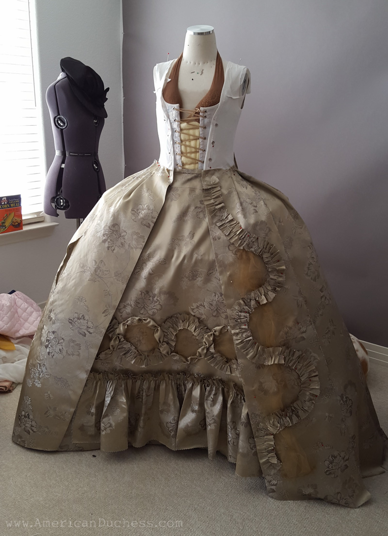 | Trims - finished on the petticoat and in progress on the gown front panels. |